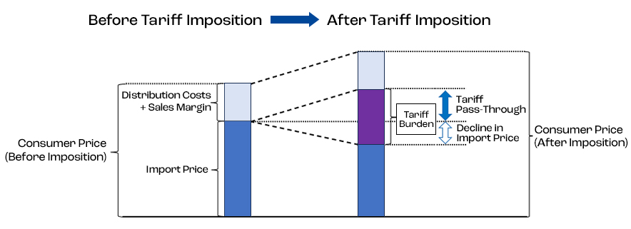 - Tariff impacts on consumer prices depend on “tariff pass-through,” and the pass-through rate varies according to the price sensitivity of import quantities and market structure.