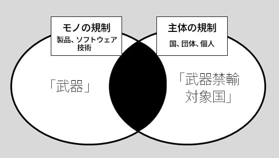 一般的に輸出規制は、「モノ(製品、ソフトウェア、技術)」と「主体(国、団体、個人)」という二つの軸から検討される。たとえば図1のように、武器輸出については、武器というカテゴリーに属する製品のリストと、武器禁輸対象国というカテゴリーに属する国のリストを照らし合わせ、その両方が重なった部分について輸出が制限される。すなわち、輸出規制は「モノ」と「主体」の掛け算で行われる(厳密には「用途」という第三の軸もある)。